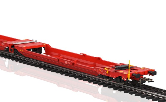 • Art. 47470 ein Wagen der DB AG mit zwei LKW Aufliefern "DB Schenker" beladen (Herpa-Modelle). Dieser Wagen besitzt je zwei seitliche Klappriegel je Wagenhälfte und Seite. Das Übergangsblech zwischen den beiden Wagenhälften ist als Gitter-Ätzteil ausgeführt und separat angesetzt.