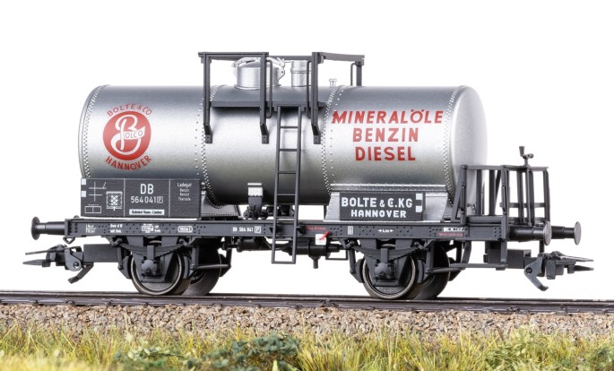 Kesselwagen der sogenannten Verbandsbauart, wie sie ab ca. 1915 in Dienst gestellt wurden. Diese Wagen besitzen einen mittelgroßen Kessel mit einen Fassungsvermögen von im Vorbild 19,2 m³.Die vollständig neu konstruierten H0 Modelle werden in einem Set mit 6 unterschiedlichen, bei der Deutschen Bundesbahn eingestellten Wagen angeboten. Der Betriebszustand spiegelt die Zeit zwischen 1950 und 1960 wider.